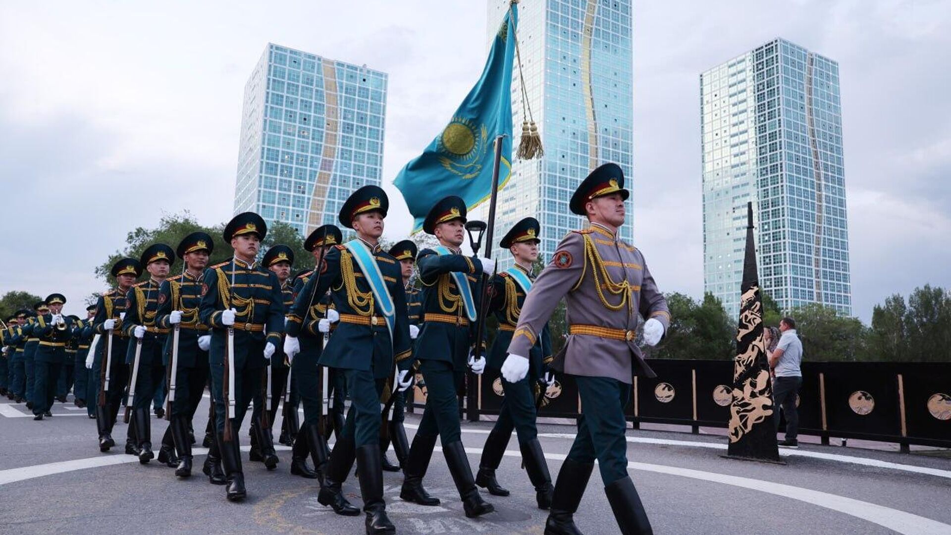 Құрмет қарауыл ротасының әскери қызметшілері көк Туымызды мерекелік шерудің алдыңғы шебінде салтанатпен алып жүрді, ал ашық аспан астындағы сахнада ұландық музыканттардың орындауында Мемлекеттік Әнұран шырқалды.