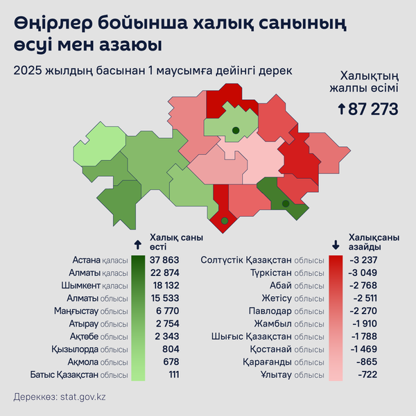 АСТАНА, 2 шілде – Sputnik. Ұлттық статистика бюросы алты айдағы ішкі көші-қон туралы ақпаратты жариялады.2025 жылдың 1 маусымындағы жағдай бойынша Қазақстан халқының саны 20 370 672 адамды құрады. Жыл басынан бері өсім 87,2 мың адамды құрады, оның ішінде:Түркістан облысы халық санының өсімі бойынша ең төменгі көрсеткішке ие болды. Табиғи өсім бойынша облыс көш бастап тұрса да, аймақта туғандар санына қарағанда кетіп жатқандар саны көбірек:Бұл ретте Астанада халық санының өсімі шамамен 37 мың адамды, Алматыда 23 мыңға жуық адамды құрады.