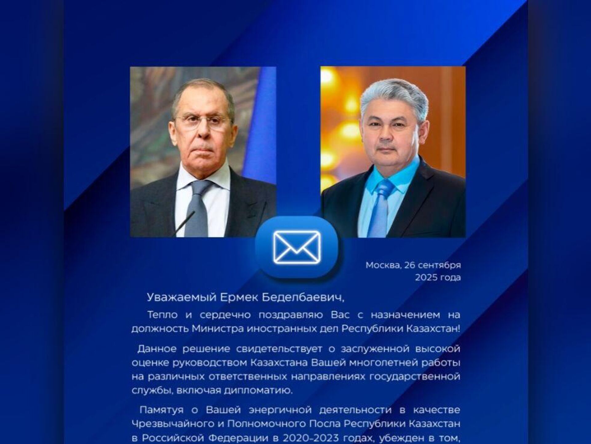 "Құрметті Ербек Беделханұлы, Сізді Қазақстан Республикасының Сыртқы істер министрі қызметіне тағайындалуыңызбен шын жүректен құттықтаймы! Бұл шешім Қазақстан басшылығы тарапынан Сіздің мемлекеттік қызметтің сан алуан жауапты бағыттарындағы, соның ішінде дипломатия саласындағы көпжылдық жұмысыңыздың лайықты жоғары бағасын алып отырғанын көрсеттті", - делінген хатта.